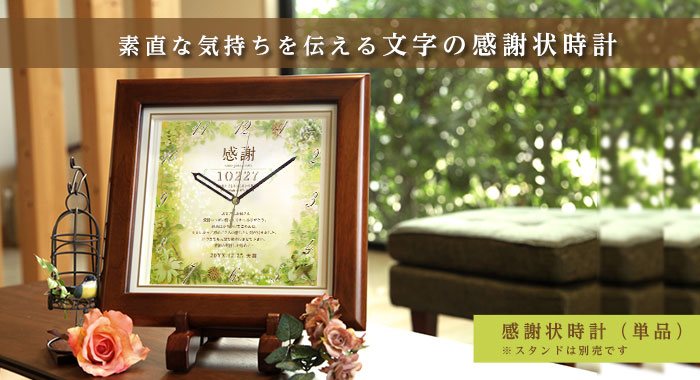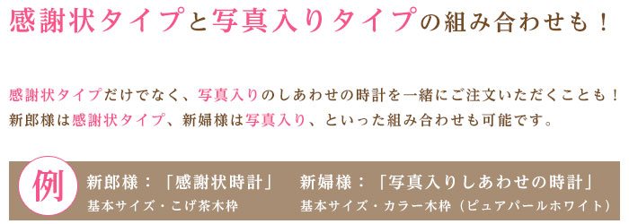 しあわせの時計の中でも、一番早く仕上がる「感謝状時計」。写真を入れないので、写真を用意する時間が短縮できます。お急ぎの方、式まで時間がない方、短納期で届けてほしい方におすすめです。